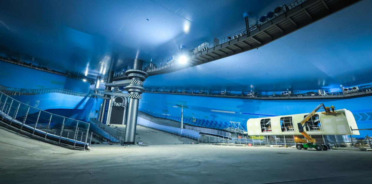 盡管室內(nèi)滑雪場(chǎng)仍在施工中,但嶄新的雪具大廳已經(jīng)進(jìn)入裝修的最后階段,分布在墻上和頂棚的藍(lán)色光帶營(yíng)造的雪花造型,給人以強(qiáng)烈的視覺沖擊。進(jìn)入到滑雪場(chǎng)內(nèi)部,四條不同等級(jí)的雪道顯露真容,拖掛式纜車的核心設(shè)備已安裝到位,空中纜線基本鋪設(shè)完成。