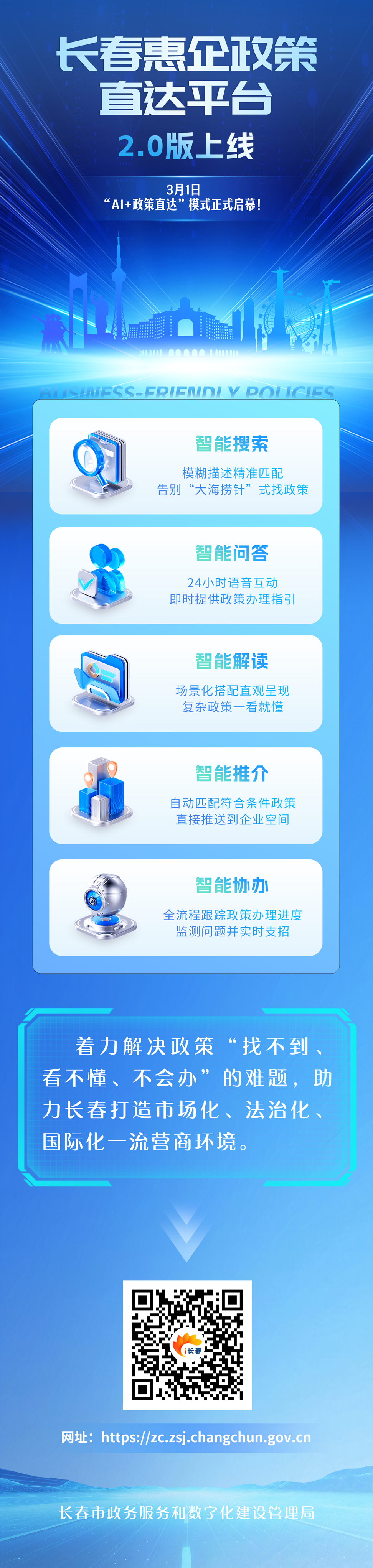 長(zhǎng)春市政數(shù)局營(yíng)商環(huán)境服務(wù)處二級(jí)調(diào)研員傅強(qiáng)介紹,2021年,長(zhǎng)春惠企政策直達(dá)平臺(tái)1.0版上線。經(jīng)過五年實(shí)踐打磨完成全面升級(jí),2.0版主打大數(shù)據(jù)+人工智能技術(shù),從企業(yè)視角打造AI應(yīng)用場(chǎng)景,讓企業(yè)輕松找政策、方便辦政策。