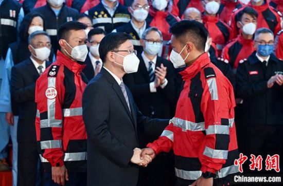 圖為香港特區(qū)行政長(zhǎng)官李家超迎接救援隊(duì)隊(duì)員返港。 中新社記者 李志華 攝