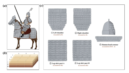 本研究對象是目前世界上已知最早的可復(fù)原甲騎具裝實(shí)物—出土于遼寧北票喇嘛洞墓地的珍貴遺存。研究結(jié)果表明,這套甲胄從結(jié)構(gòu)設(shè)計(jì)到材質(zhì)加工均體現(xiàn)出高度的技術(shù)成熟度,證明鮮卑在公元4至5世紀(jì)已具備先進(jìn)的甲胄制造能力;而古蛋白質(zhì)組學(xué)分析首次證實(shí),甲胄制作中使用了羊源材料——這一發(fā)現(xiàn)填補(bǔ)了古代游牧民族甲胄材質(zhì)研究的空白,為探討當(dāng)時(shí)草原地區(qū)的動物資源利用、畜牧業(yè)發(fā)展與軍事手工業(yè)的關(guān)聯(lián)提供了直接證據(jù)。