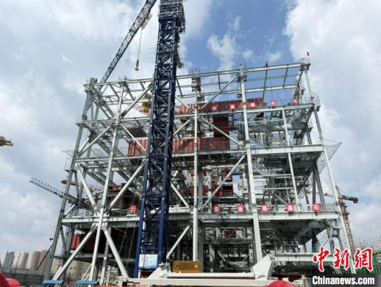 記者在施工現(xiàn)場(chǎng)看到,千余名工人與塔吊等機(jī)械協(xié)同作業(yè),安裝鍋爐鋼架、煙筒筒壁、冷卻塔、脫硫設(shè)施等關(guān)鍵設(shè)施。