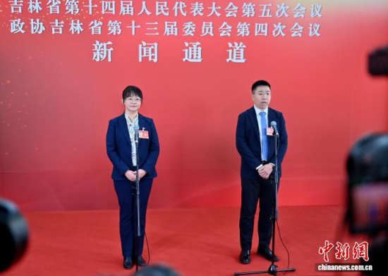 1月26日,在政協(xié)吉林省第十三屆委員會(huì)第四次會(huì)議委員通道上,侯佳貝(右一)回答記者提問。張瑤 攝