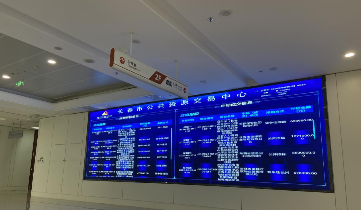 在長春市政務(wù)服務(wù)中心二樓,記者看到,這里設(shè)有開標(biāo)室、澄清室等多個功能區(qū)域,LED屏幕實時滾動著政府采購近期開標(biāo)項目和中標(biāo)成交信息,方便企業(yè)人員隨時查看、跟蹤項目進展。