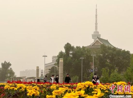 長春文化廣場雕塑。 郭佳 攝市民在公園散步。 郭佳 攝城市上空昏黃一片!」选z沙塵天氣使能見度降低!」选z城市綠樹被沙塵籠罩。 郭佳 攝