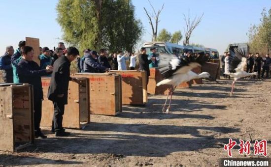 中新網(wǎng)長春11月19日電 (張瑤 王萬峰)吉林省林業(yè)和草原局19日介紹,該局近日組織野生動(dòng)物救護(hù)部門將救助的11只東方白鸛成功護(hù)送到天津七里海國家濕地公園與已遷徙至那里的種群匯合。這是吉林省第一次大規(guī)?缡∽o(hù)送“鳥界國寶”東方白鸛歸隊(duì)。