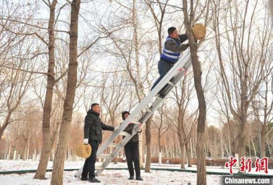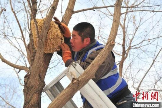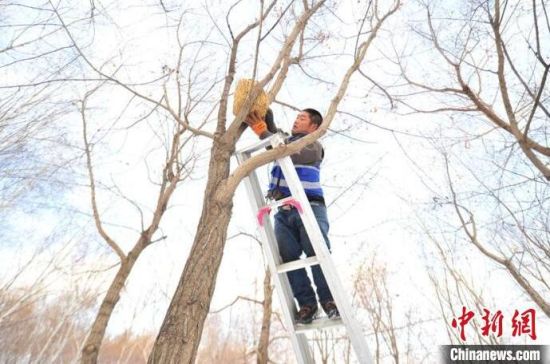 11月23日,趁著雪后天晴,吉林長春友誼公園的工作人員忙著維護樹上的草編鳥巢,并投放了鳥糧。該公園生態(tài)環(huán)境好、野生鳥類多,園方已經連續(xù)三年在園區(qū)設置百余個草編鳥巢助鳥類安全過冬。