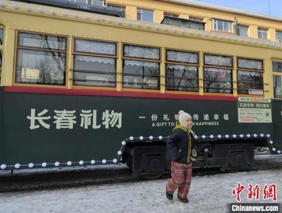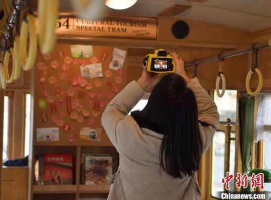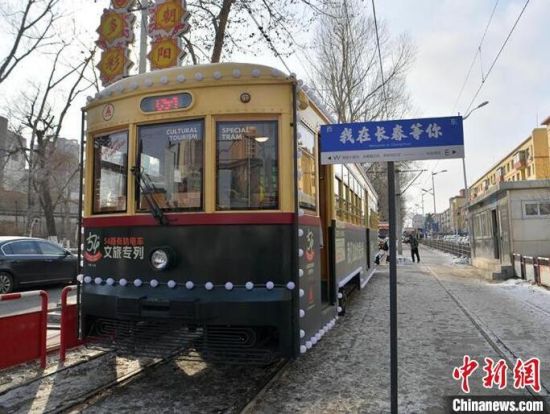 1月8日,吉林長春,一輛54路有軌電車文旅專列吸引游客打卡拍照。該專列外形復(fù)古,車廂布置獨(dú)具特色,游客預(yù)約后可購票乘車體驗(yàn)車內(nèi)及市區(qū)沿線的人文風(fēng)情。