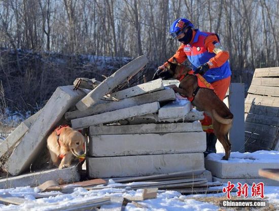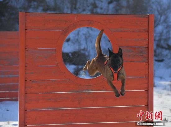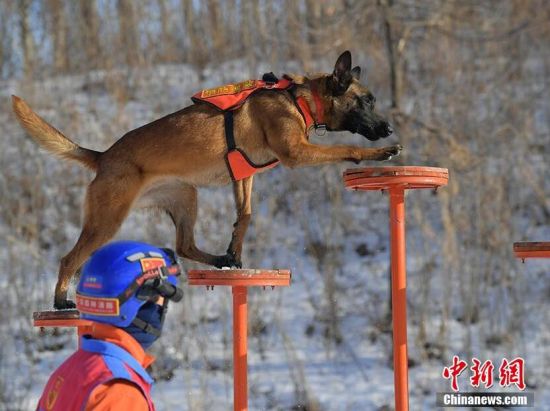 1月18日,在吉林省森林消防總隊特勤大隊訓(xùn)練場內(nèi),搜救犬正在訓(xùn)練。為提高搜救犬在嚴(yán)寒環(huán)境的適應(yīng)和實(shí)戰(zhàn)能力,吉林省森林消防總隊特勤大隊搜救犬分隊近期通過障礙攀登、繞腿訓(xùn)練、廢墟搜索訓(xùn)練等科目,對搜救犬進(jìn)行冬訓(xùn),進(jìn)一步提升訓(xùn)導(dǎo)員與搜救犬的默契度和技戰(zhàn)素養(yǎng)。