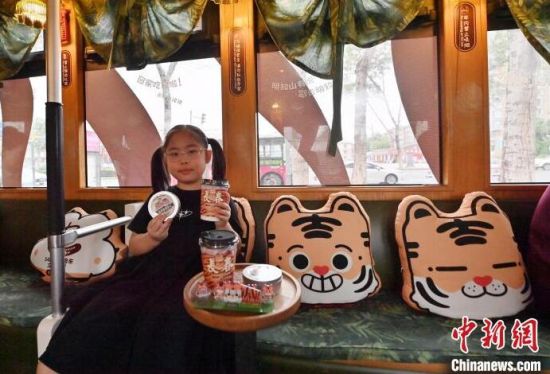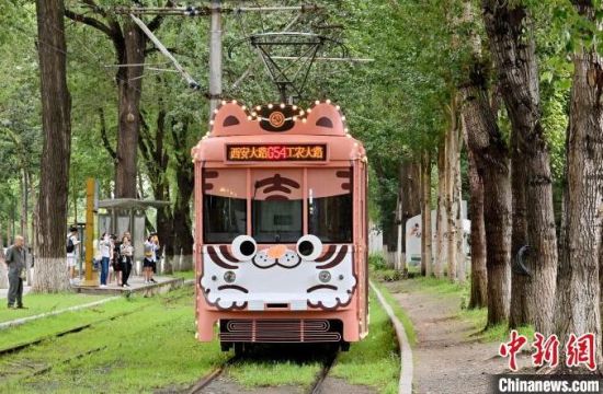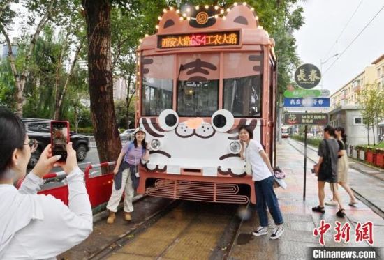 8月5日,吉林長(zhǎng)春,游客在54路文旅東北虎專列內(nèi)拍照。該專列是以“東北虎”為主題的有軌電車文旅專列,步入其中、綠意盈盈“森系”十足,吸引眾多游客前來打卡。(中新社記者 張瑤/攝)