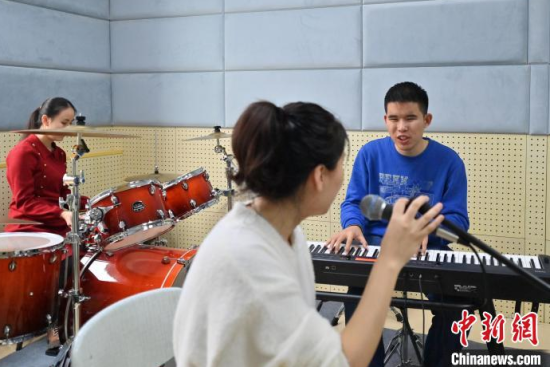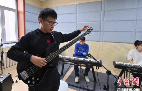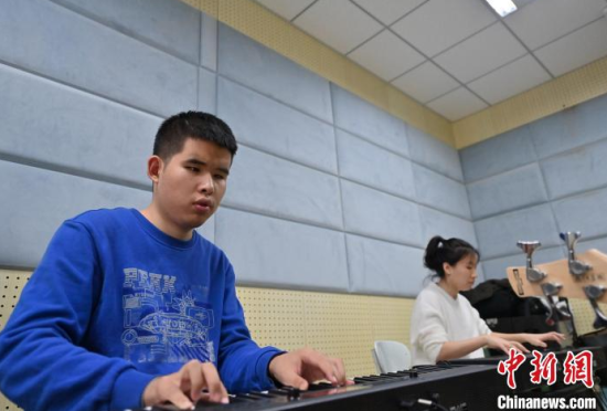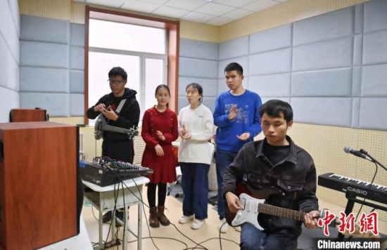 11月14日,吉林長春,“逐暗逐光”樂隊(duì)成員在交流排練細(xì)節(jié)。長春大學(xué)特教學(xué)院有一支名叫“逐暗逐光”的樂隊(duì),樂隊(duì)成員都是視障學(xué)生。他們因音樂相聚在一起,用音樂去驅(qū)逐黑暗追逐光明。中新社記者 張瑤 攝