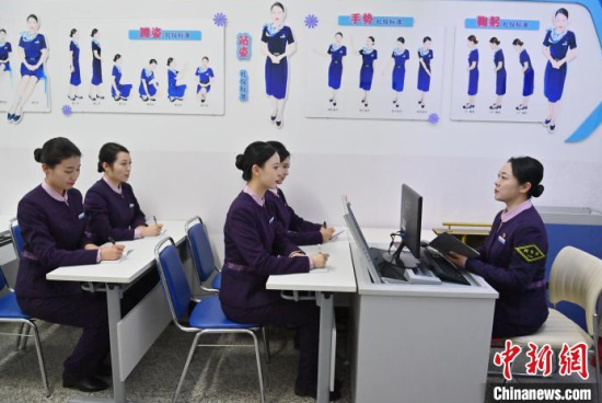 1月7日,吉林長春,“動姐”在進行安全知識培訓(xùn)。春運臨近,為提升服務(wù)品質(zhì),沈陽局集團公司長春客運段動車一隊的乘務(wù)員們利用業(yè)余時間開展基礎(chǔ)禮儀、職業(yè)形象、服務(wù)技巧等內(nèi)容的培訓(xùn)。中新社記者 張瑤 攝