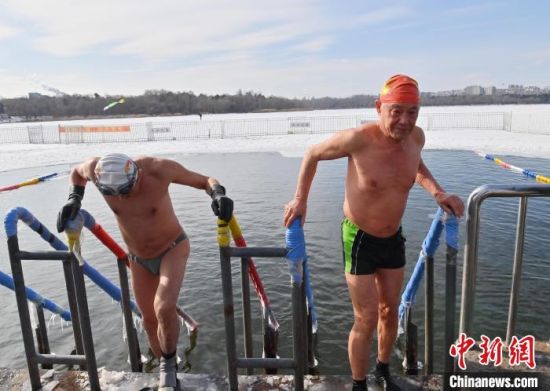 2月19日,在長春南湖公園,吳長海(右)準(zhǔn)備和泳友一起冬泳。今年85歲的吳長海堅(jiān)持冬泳已有三十余年,冬泳已成為他每天生活中必不可少的一件事。當(dāng)天長春氣溫達(dá)零下17攝氏度,吳長海說,冬泳使他身體強(qiáng)壯,以后會堅(jiān)持下去。中新社記者 張瑤 攝