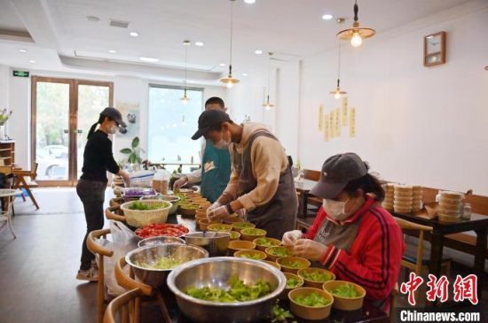 5月8日,吉林長春,“天使之家”餐飲店的店員在收拾餐桌。這里的部分工作人員是孤獨癥患者,這家店旨在助力青年孤獨癥群體就業(yè),融入社會。他們通過訓(xùn)練,已經(jīng)可以完成切菜、備餐、收拾店內(nèi)衛(wèi)生、撤餐等工作。中新社記者 張瑤 攝