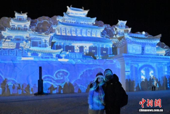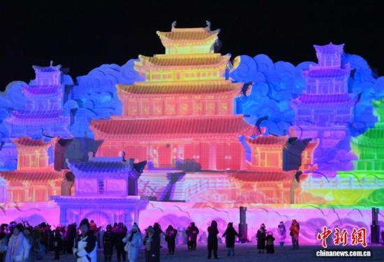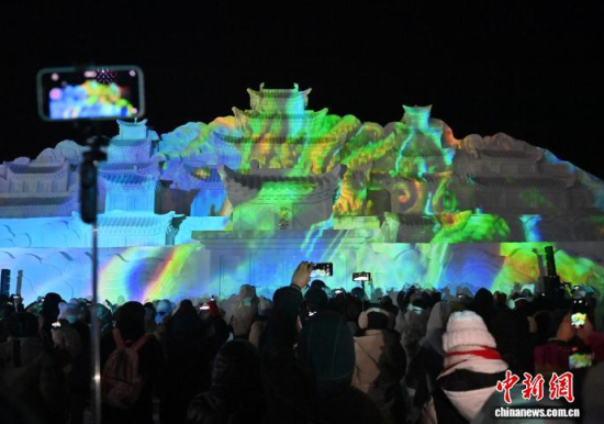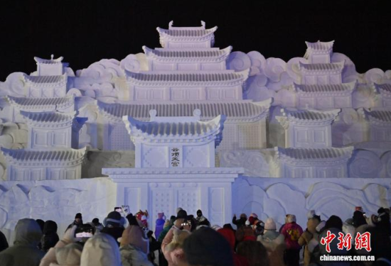 12月26日晚,吉林長白山,新落成的高30米、寬70米、用雪量10萬立方米的雪雕版“云頂天宮”正式點亮。這座以探險題材小說《盜墓筆記》為藍本雕琢的冰雪地標廣受書迷關注。中新社記者 張瑤 攝