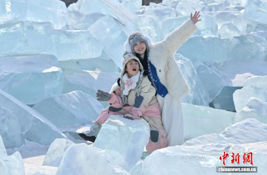 2月9日,在長春凈月潭國家森林公園內(nèi),由水庫天然冰塊堆砌而成的“藍冰”景觀,吸引市民打卡拍照!八{冰”是指致密堅硬的冰,因冰內(nèi)部空氣被擠掉而變得晶瑩透徹,這時陽光中波長較短的藍光被致密堅厚的冰層散射,冰塊便呈現(xiàn)出水晶般美麗的藍色。中新社記者 張瑤 攝