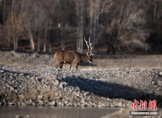 2023年1月24日,西藏拉薩市達(dá)孜區(qū)幫堆鄉(xiāng)附近,白唇鹿在拉薩河畔覓食。中新社記者 貢嘎來松 攝